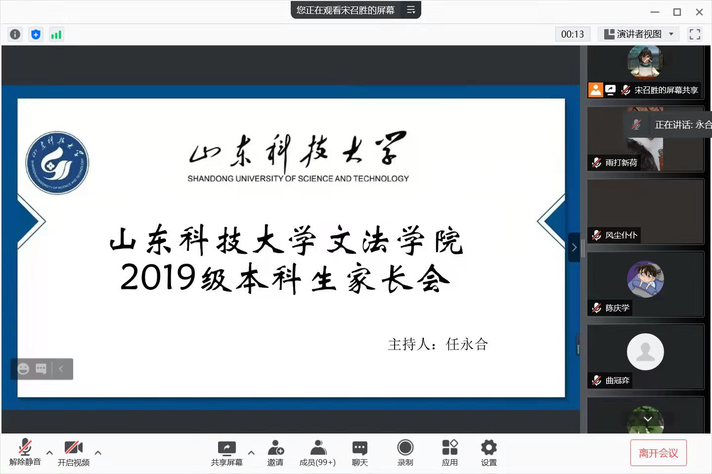 2019级辅导员任永合从第二课堂成绩预警、职业生涯规划、家校共育、心理健康与安全教育等四个方面向参会家长展开交流,并结合实际事例,对学生未来发展的三大方向——考研、考公、找工作进行了利弊分析和答疑解惑。家长们在此次交流会中也积极参与发言,针对考研择校问题、选调生的条件和要求以及找工作所需要的各方面综合素质等问题任永合都进行了耐心分析和解答。