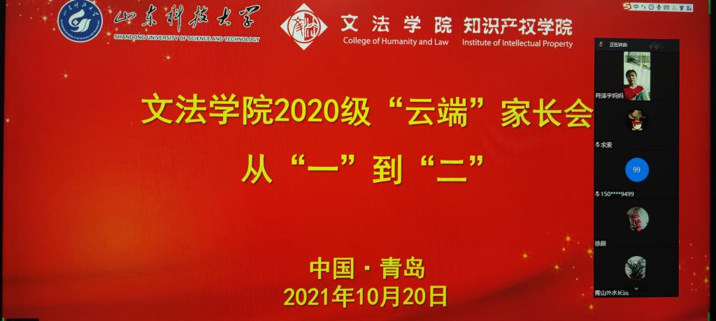 2020级辅导员韩丙华以“从‘一’到‘二’”为主题开展云端家长会。在会议中,他分别从“回首总结过去的‘一’”“把握利用现在的‘二’”“统筹谋划将来的‘三’”三个方面展开,向全体家长报告了2020级学生在大一学年的表现和收获,对学业成绩、第二课堂、专业竞赛、社会实践等内容进行了详细解读,同时与家长达成了“家校共建、共育、共督促”的育人模式。