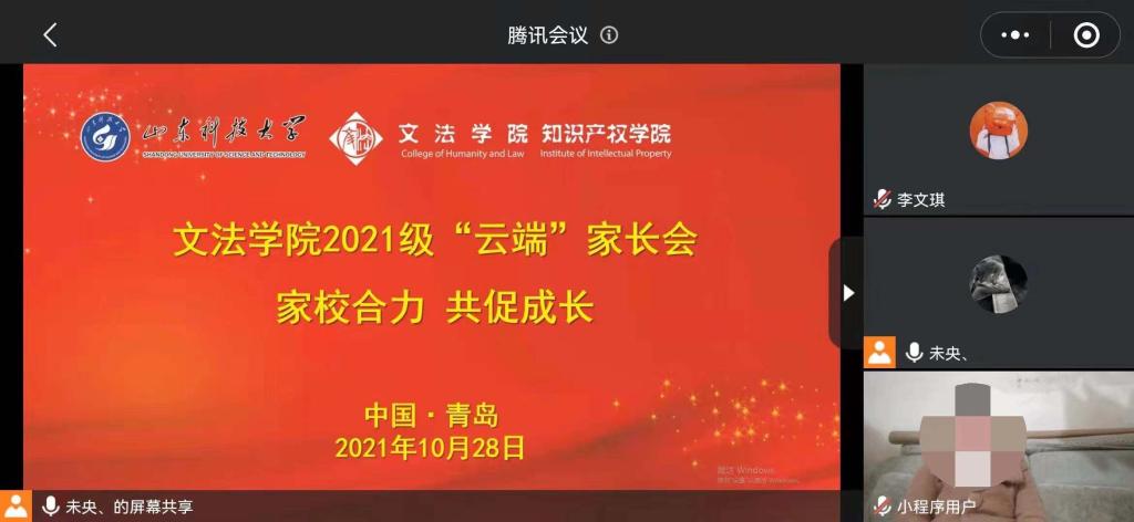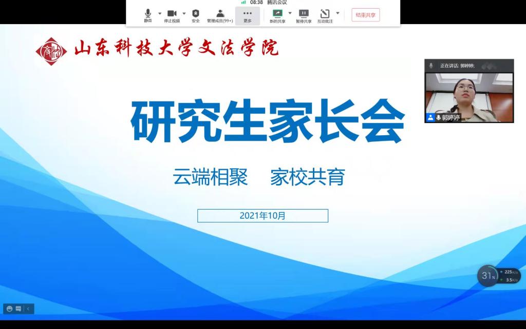 2021级辅导员王晓迪首先向家长们介绍了学院近年来在教学科研、学科建设、师资队伍、学生培养和教育等方面取得的成绩;然后向家长们汇报了学生入学以来的表现情况,介绍了学院针对2021级学生开展的新生入学系列教育、军训成效、学生文体活动等以及分析了各专业的职业生涯规划;最后聚焦新生入学适应性教育,强调了家校共育对学生健康成长的重要意义。
