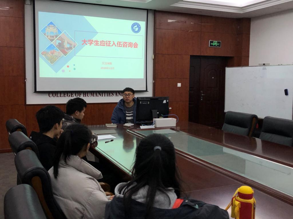 12月22日,3044am永利集团3044noc在9号楼321会议室组织大学生应征入伍咨询会。会议由辅导员任永合主持,有应征入伍意愿的同学参会。