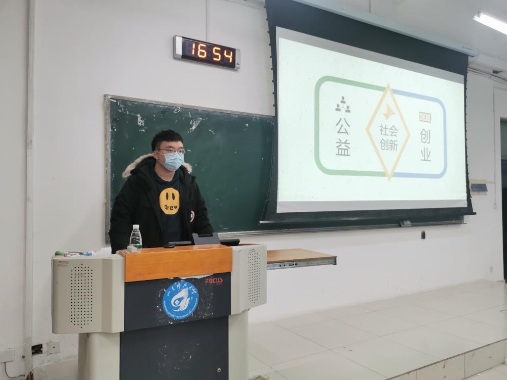 主持人进行简短的介绍之后,赵子一同学围绕大学生创新创业教育,依次从社会创新初探、社会创新工作坊、项目计划书三个方面展开讲解。