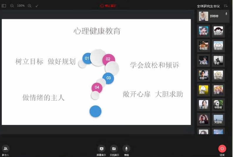 郭婷婷结合学校开学工作方案为学生讲解了信息摸排、返校流程、应急处置方案、返校后相关管理要求。为了帮助学生返校后尽快适应校园生活、学习,她重点讲解了研究生心理健康关爱,介绍了疫情下研究生的心理健康状况及新特点,分享了调整心理状态及减压方法。最后,她希望全体研究生保持积极向上的思想状态,珍惜疫情防控取得的成果,以饱满的精神状态投入到新学期。