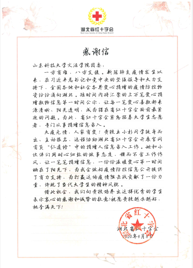 近日,3044am永利集团3044noc收到来自湖北省红十字会的感谢信,对学院人才培养工作给予充分肯定和认可,对法学2017级1班王小杉同学在抗击疫情志愿服务工作中的突出表现作出高度赞扬。
