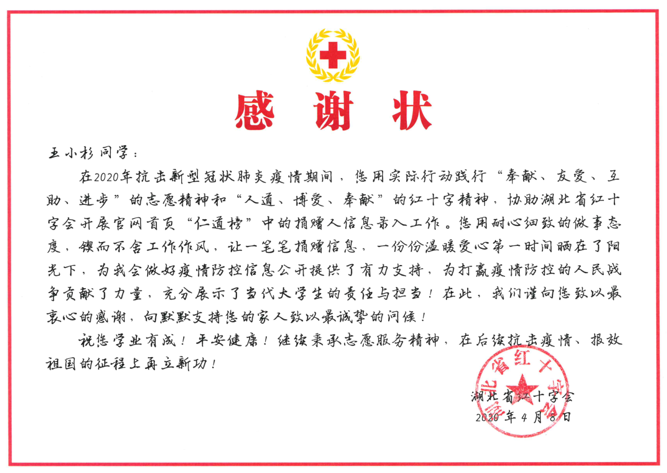 在抗击疫情关键时刻,王小杉同学挺身而出、主动报名,远程协助湖北省红十字会开展官网首页“仁道榜”中的捐赠人信息录入工作。她用耐心细致的做事态度,锲而不舍的工作作风,让一笔笔捐赠信息,一份份温暖爱心第一时间晒在了阳光下,为湖北红十字会做好疫情防控信息公开提供了有力支持,为打赢这场疫情阻击战贡献了一份力量,体现了当代大学生的精神风貌。