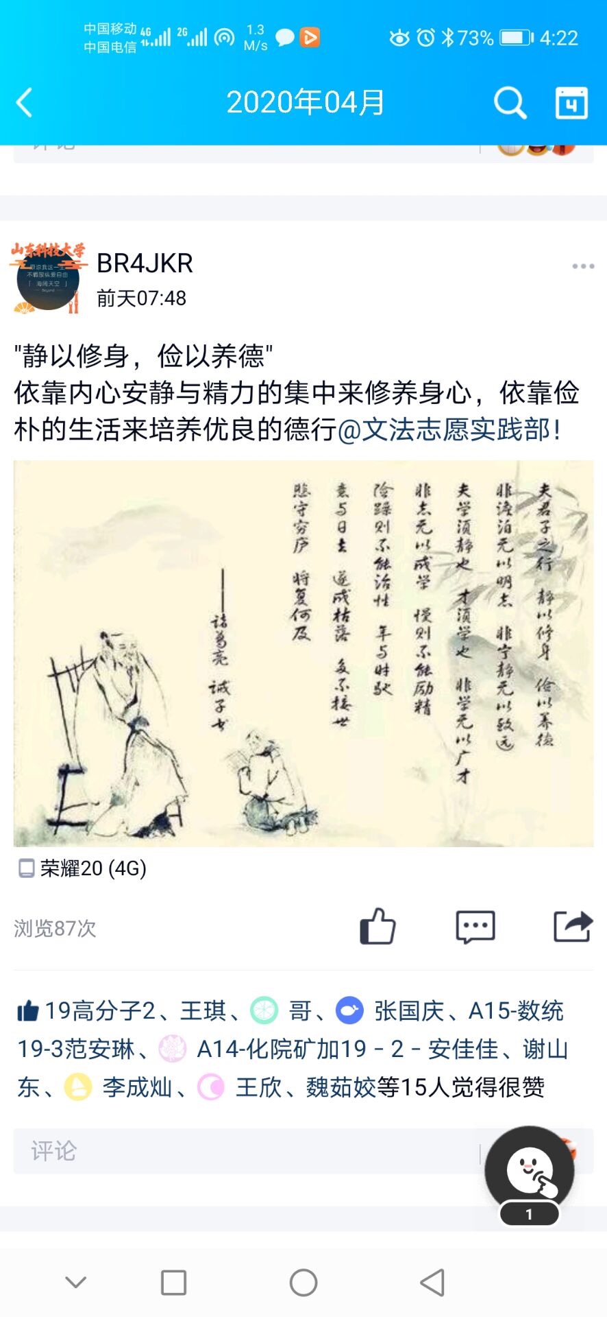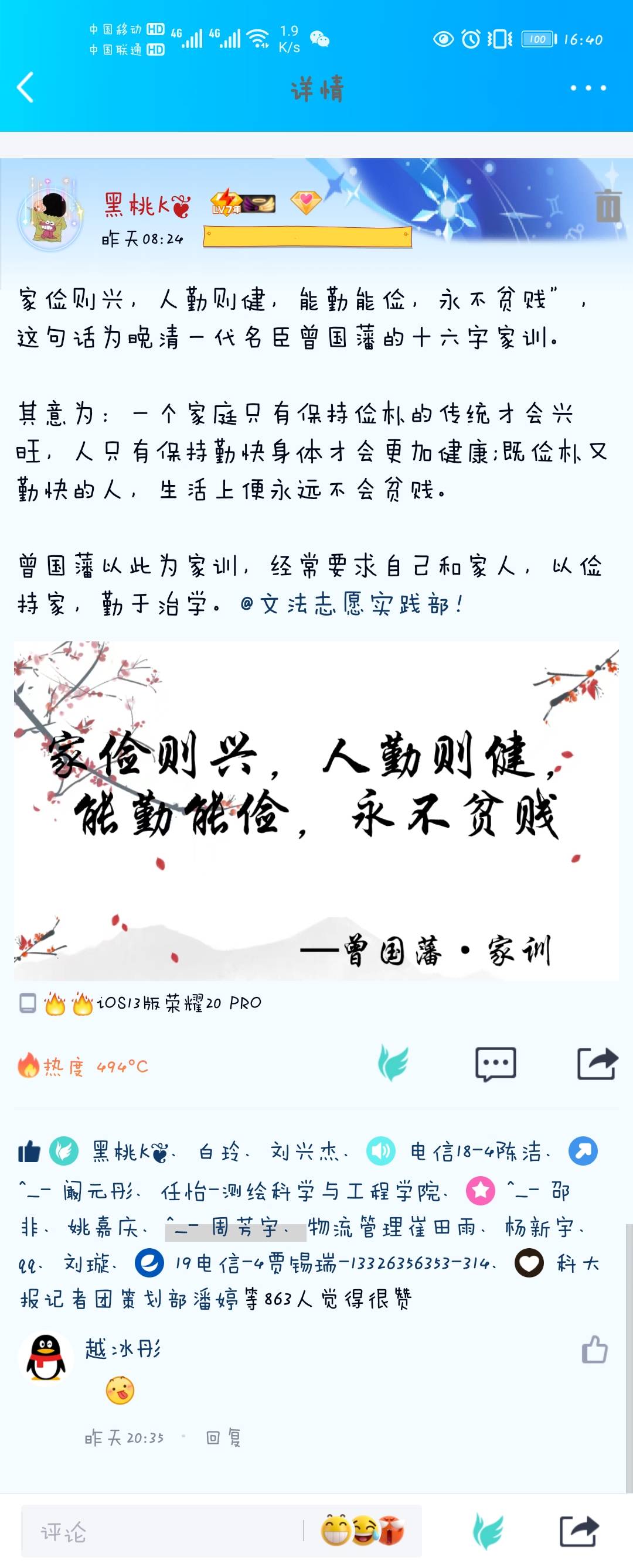 活动依托QQ和腾讯会议平台举行,参与方式采用文字及配图的方式,解说自己对家风家训的理解,同学们各具特色的解说,大大增强了此次活动的趣味性。学生会工作人员于25日晚在腾讯会议上举办家风家训小讲堂,以陆游、曾国藩等历史名人为例介绍家风家训的历史和发展历程,活动中还邀请同学们朗读梁启超的《莫问收获,但问耕耘》、张世发的《好,我一定来》等作品,让同学们在朗读中更真切的体会家风家训的重要性。