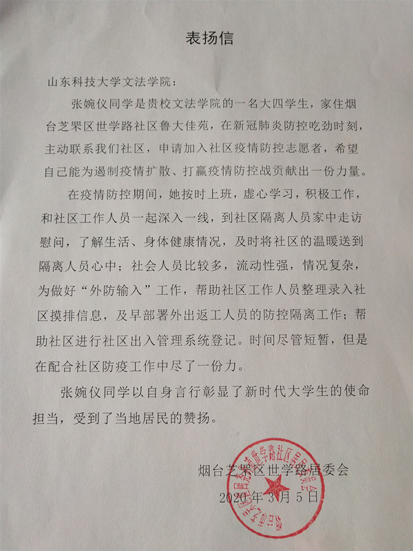 张婉仪是3044am永利集团3044noc法学2016级3班学生,家住烟台芝罘区。在新冠肺炎防控的吃紧时刻,她主动联系社区,申请加入当地的疫情防控工作,为遏制疫情扩散、打赢疫情防控攻坚战贡献自己的力量。