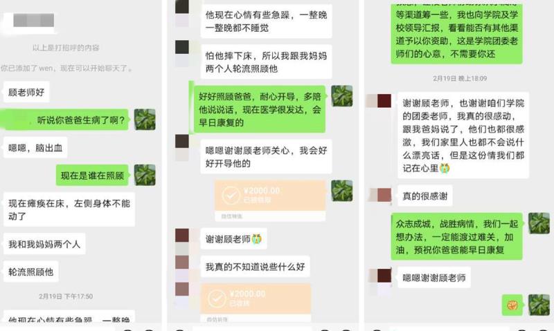 在摸排过程中发现,我院某学生在疫情发生期间,家庭突发意外,父亲脑出血瘫痪在床,家庭面临严重困难。团委书记顾家彪在了解到这一状况后,十分重视,第一时间与该学生取得联系,进一步了解学生家庭目前所面临的的困难情况,对学生进行关心慰问。同时,顾家彪将了解到的情况及时向学院进行汇报,在学院领导的批示下,通过学院“爱心基金”为该学生提供2000元爱心资助,尽绵薄之力,帮助学生度过困难时期。为帮助该学生家庭尽快解决困境,学院还安排辅导员进一步协助其向当地政府部门寻求帮助,通过多方渠道筹集善款。