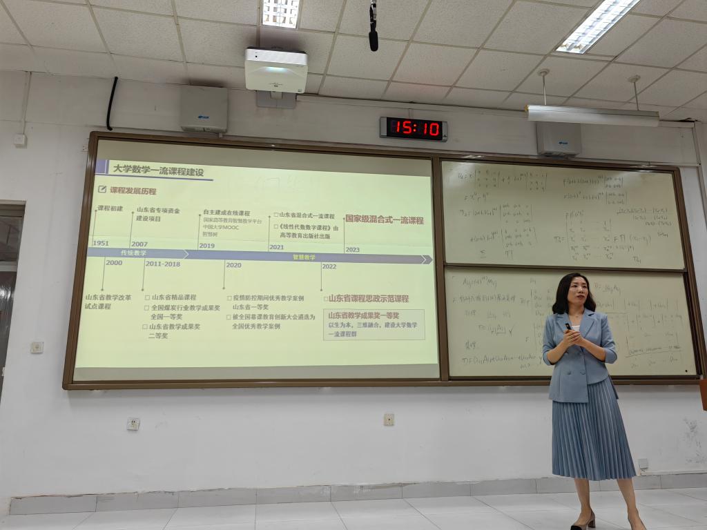 刘洪霞教授从国家级一流本科课程《线性代数》入题,针对数学知识与专业应用脱节提出混合式教学重构教学内容推动共性教育与个性学习融合、文理学科交叉素养融通,以数学文化为切入口实现全链路育人;结合山东省课程思政示范课程《高等数学》,聚焦思政课程与课程思政“在同向同行中推进‘课程思政’建设”要求,破解内容抽象导致思政融入困难等问题;在报告最后,刘洪霞教授就全国高校教师教学创新大赛的宗旨目标、评分标准、参赛作品进行了介绍,并分享了参赛经验和注意事项。