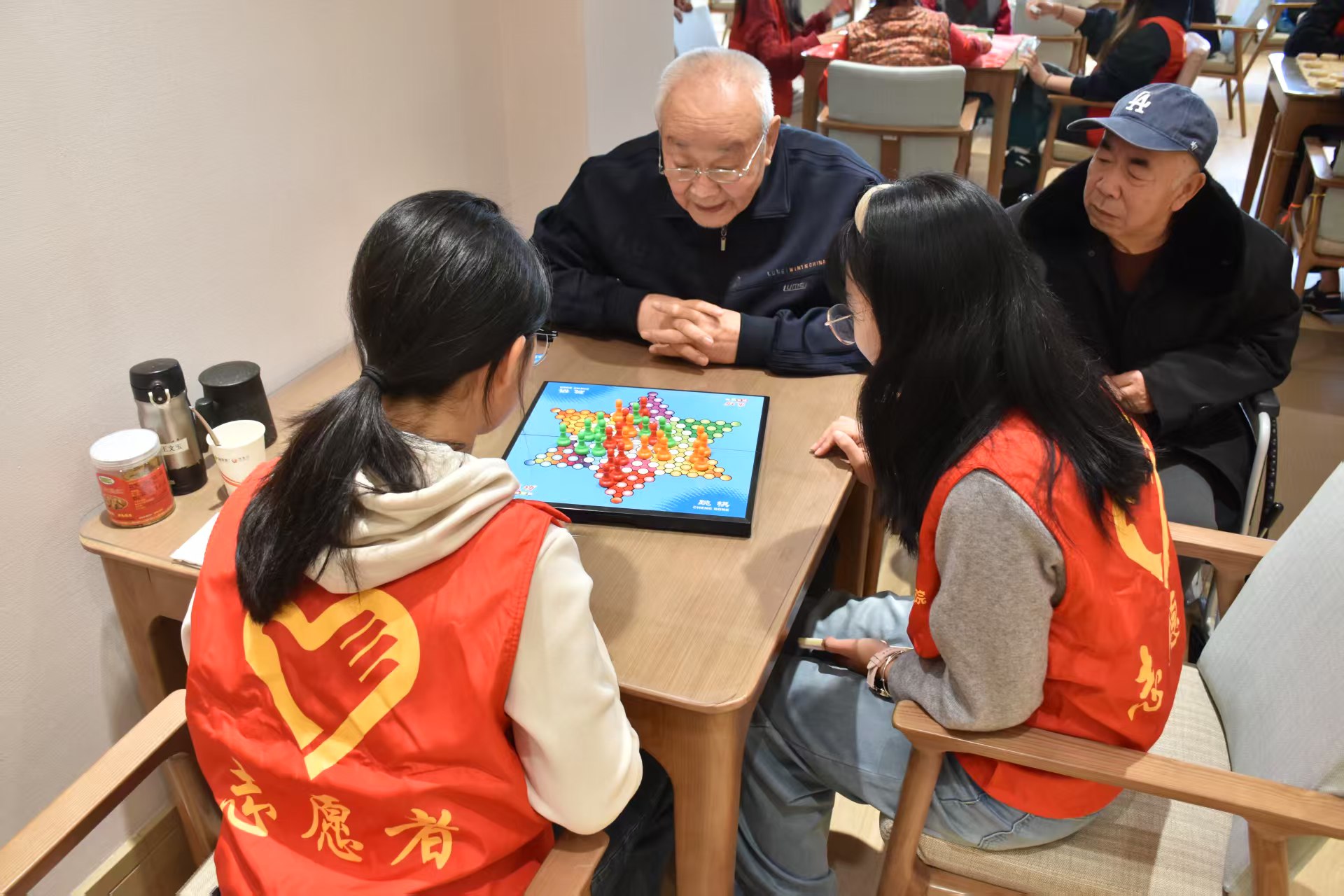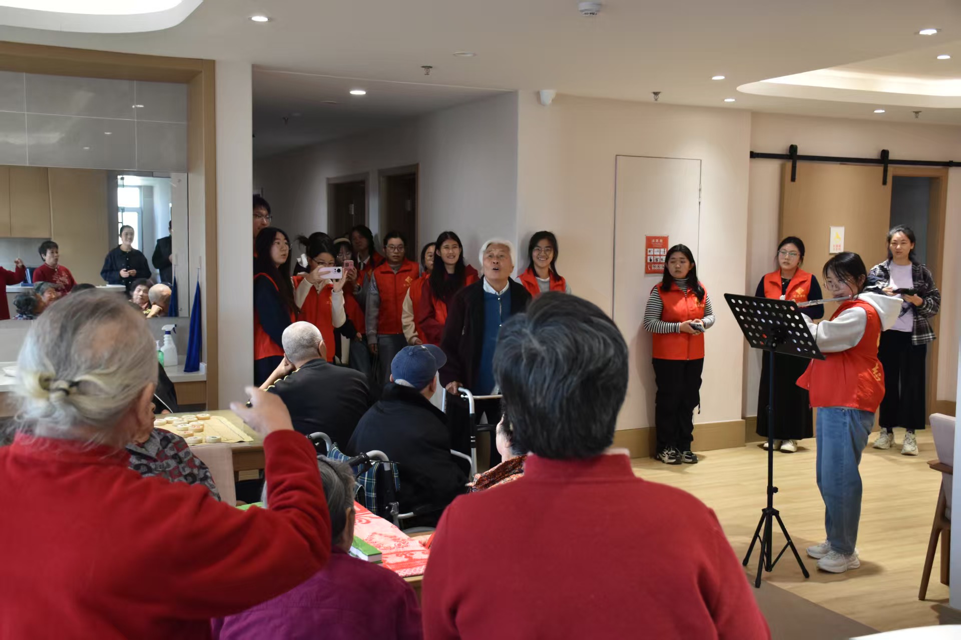 活动开场,学院器乐队的志愿者们率先登场,带来器乐演奏《梁祝》《映山红》《如愿》等经典曲目,老人们也跟着乐声一起哼唱,构成一曲曲动人的旋律,现场响起阵阵热烈而持久的掌声。演奏结束后,志愿者们迅速化身为贴心的陪伴者,积极投入到与老人们的互动交流中。有的志愿者与老人相对而坐,展开棋艺“智慧对决”。有的志愿者化身耐心的倾听者,认真聆听老人讲述过去的点点滴滴。还有一部分志愿者积极协助老人参与趣味娱乐活动,他们手把手地教老人做游戏,欢声笑语回荡在敬老院的每一个角落。