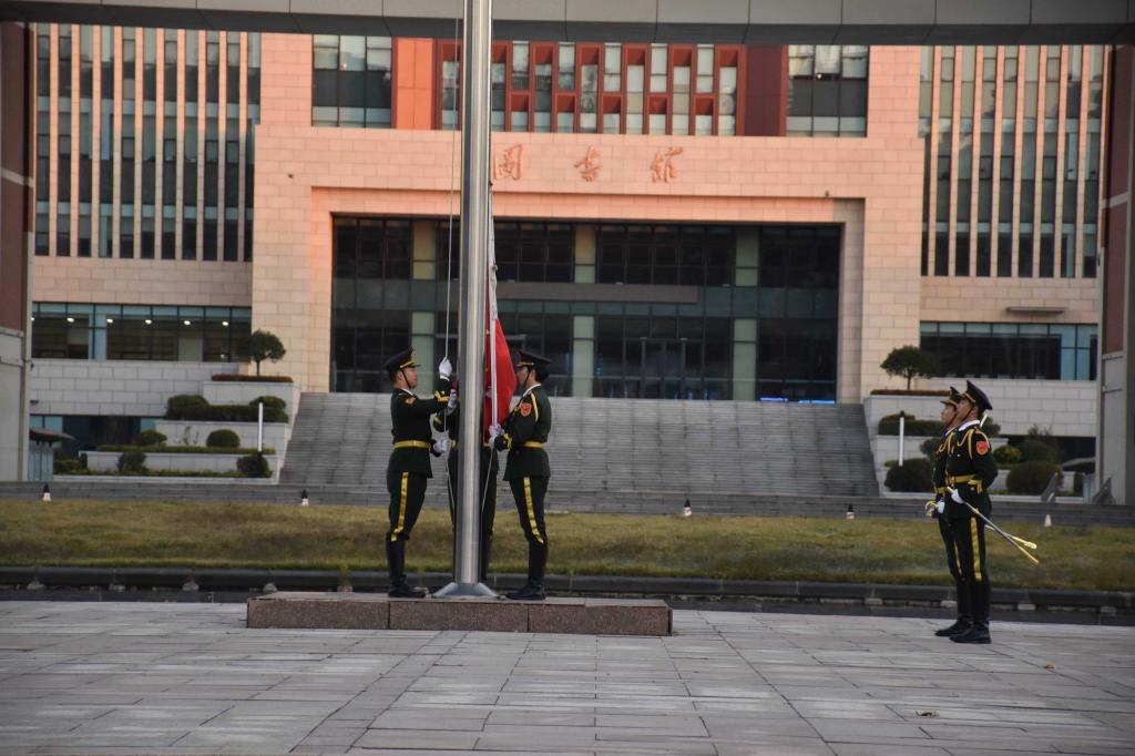 6点25分,升旗仪式正式开始。国旗护卫队迈着整齐划一、铿锵有力的步伐护送国旗入场。在雄壮的国歌声中,鲜艳的五星红旗冉冉升起,全体师生肃立行注目礼,齐声高唱国歌,表达着对祖国的热爱与敬意。