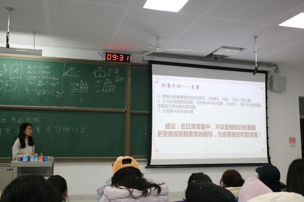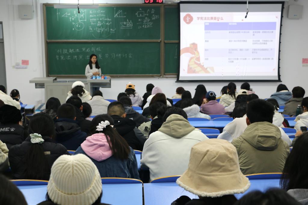 活动邀请第十届山东省学生“学宪法 讲宪法”知识竞赛一等奖获得者、2023级涉外法治实验班张笑涵同学担任主讲。张笑涵分享了参加竞赛的心路历程和宝贵经验,结合自身经历总结比赛的经验与技巧,向同学们介绍了“数据分析+智能训练”的备赛策略,利用大数据分析失分点,针对性强化薄弱环节;通过智能答题、限时训练提升答题速度与准确率。她鼓励有意向参赛的同学善用技术工具辅助学习,打破传统学习模式,提升备赛效率。